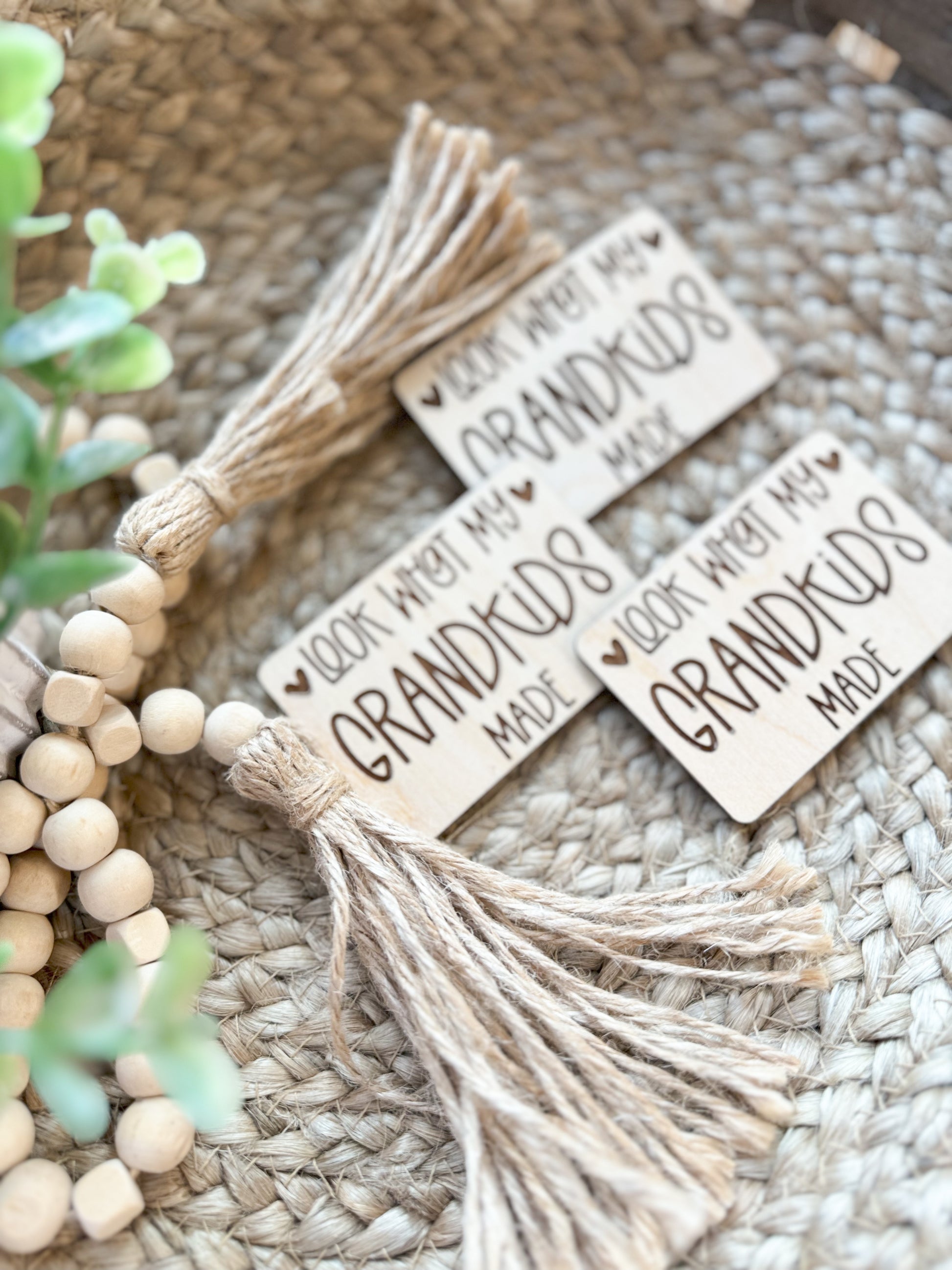 These are 3 by 2 inches in size. They come with grandkid or grandkids in the middle.