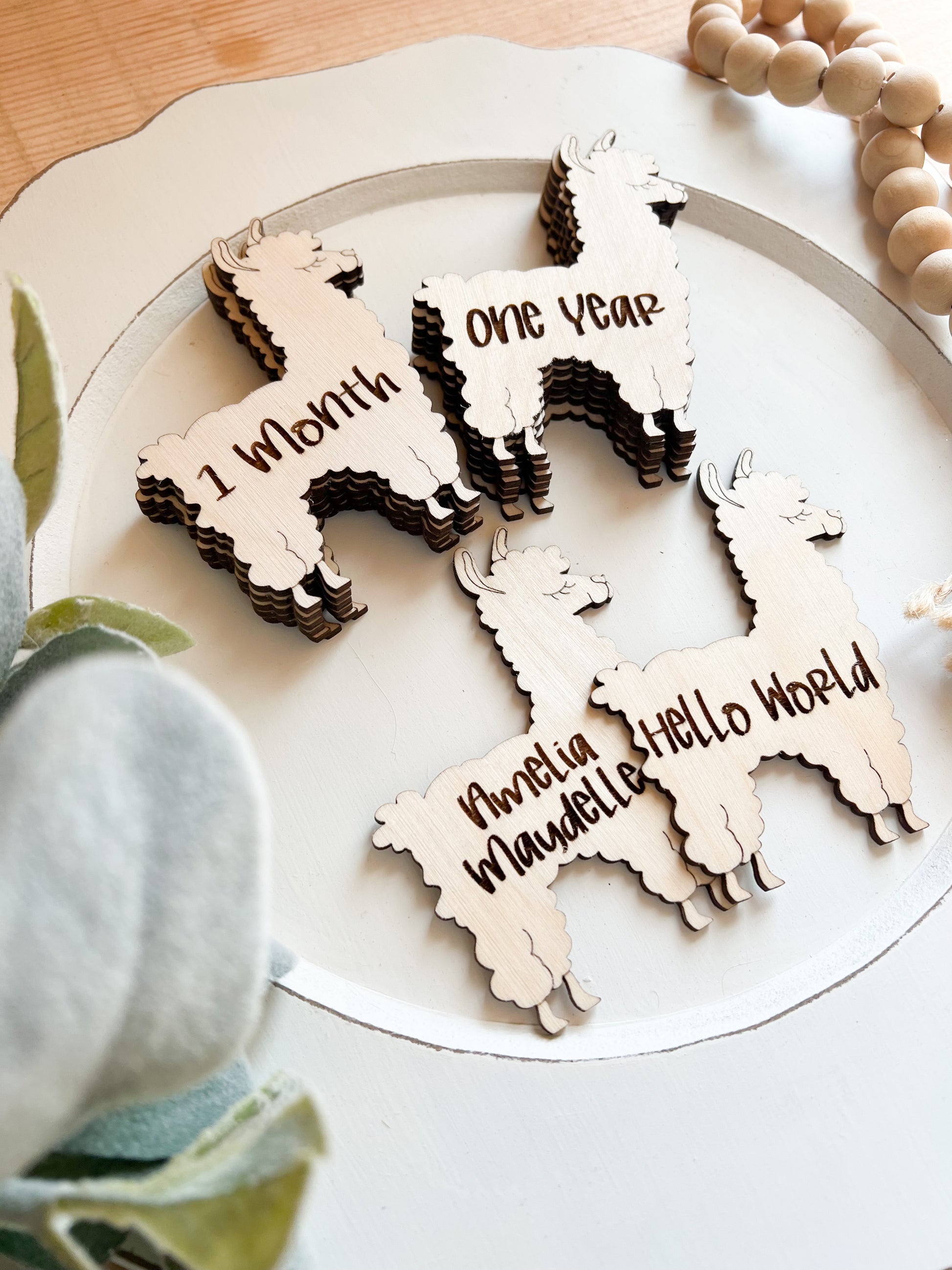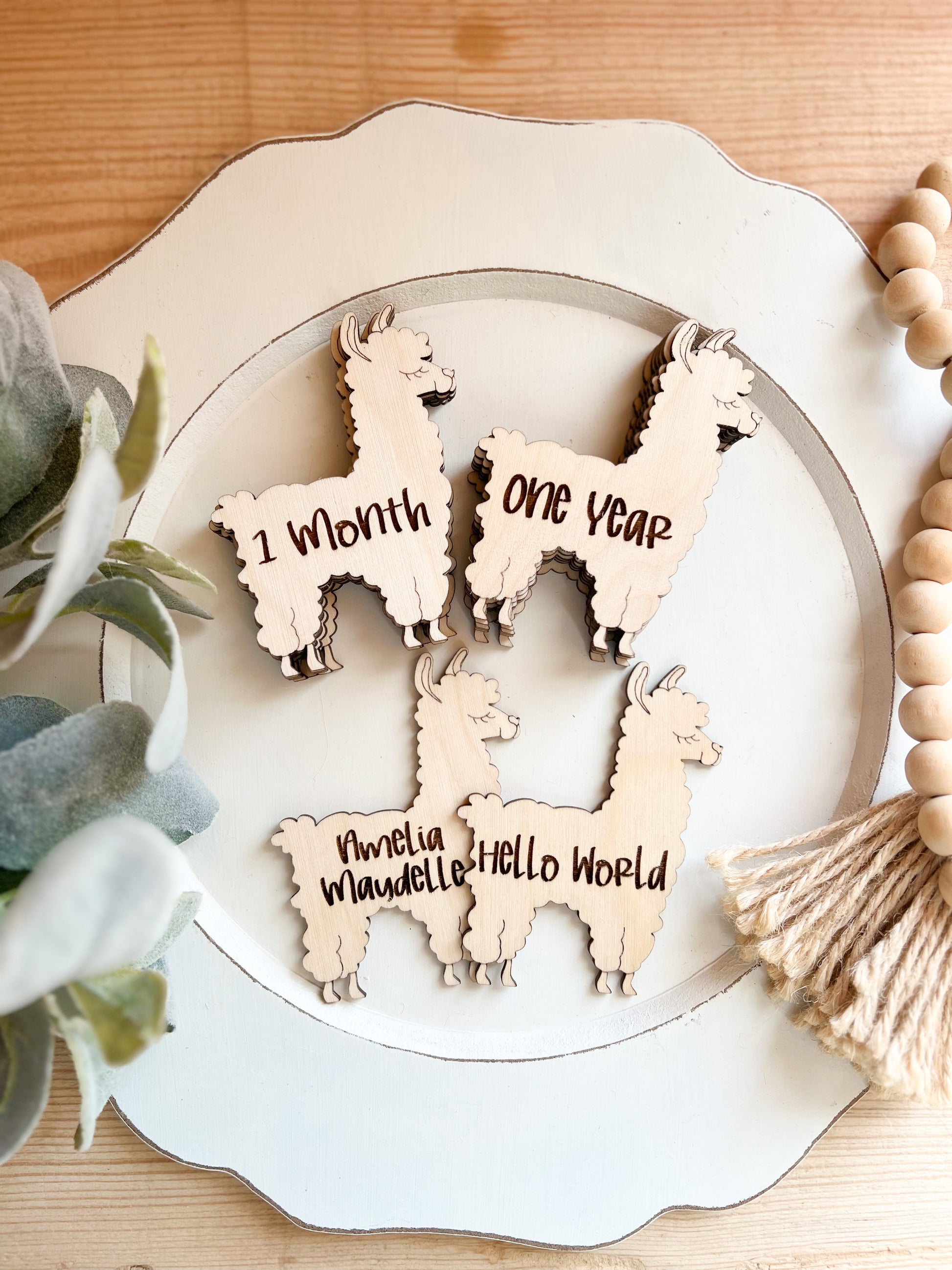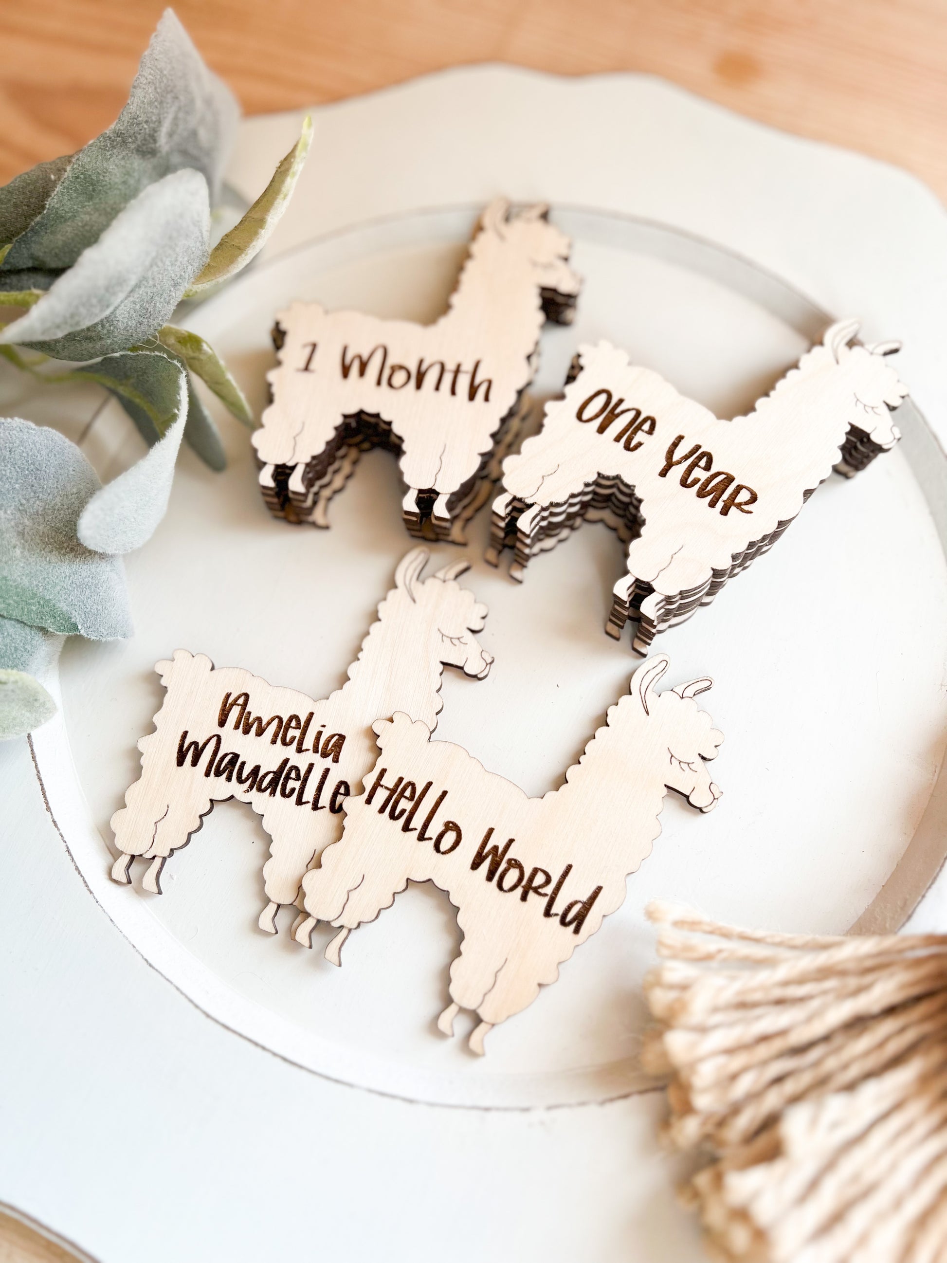 The milestones are 4 by 3 inches in size. One little llama will have your child’s name on it. Just add that to the name box.
