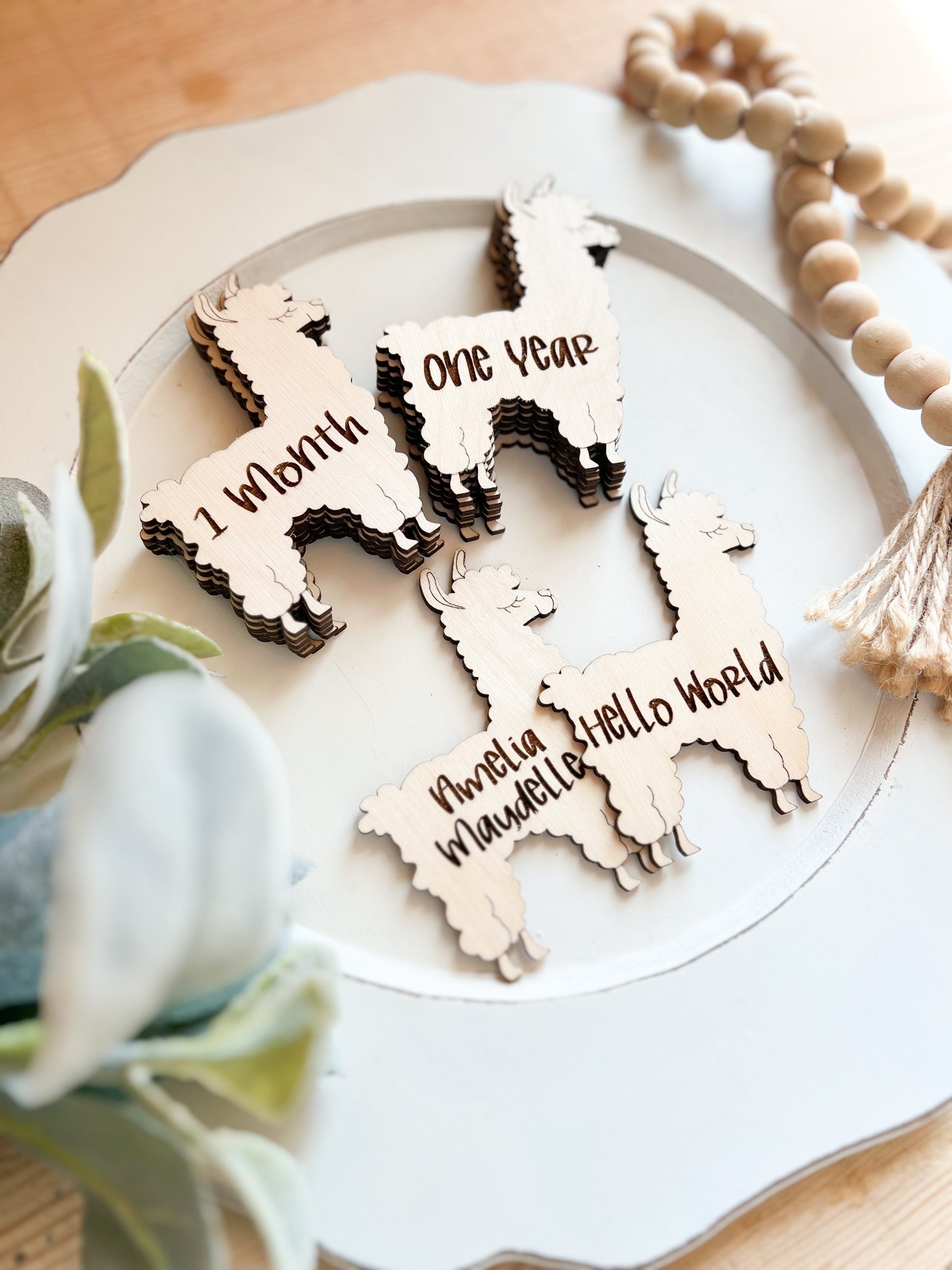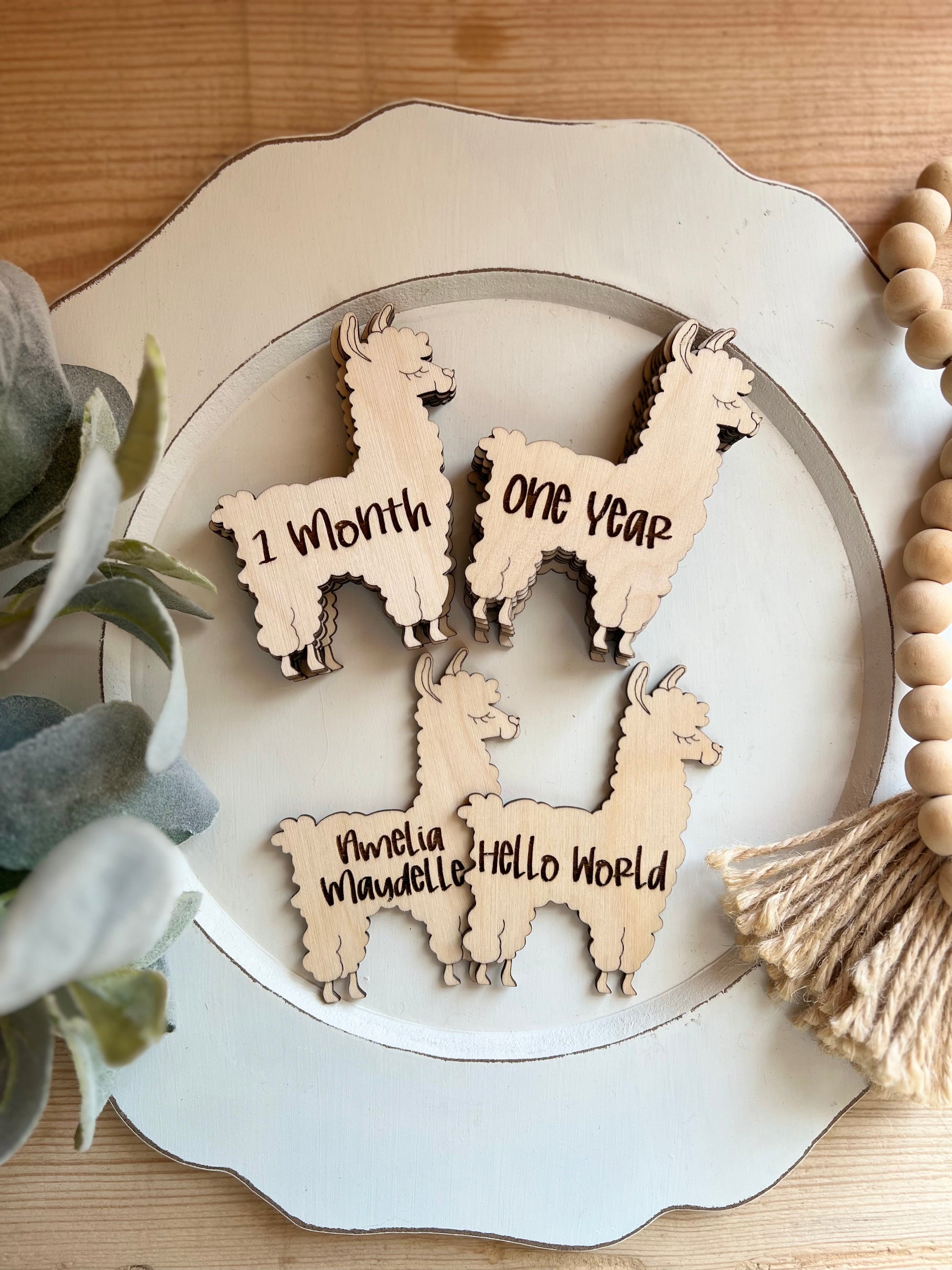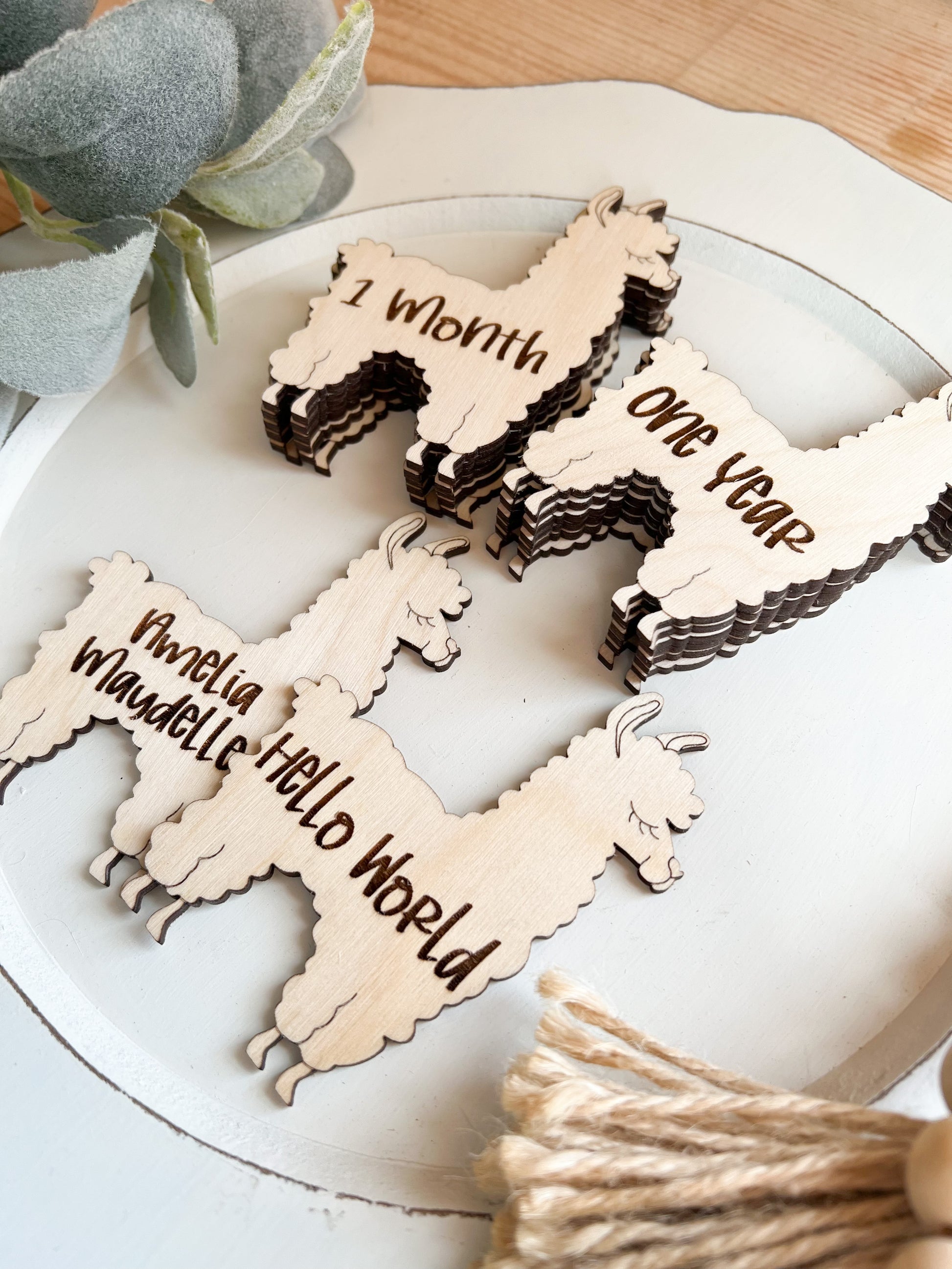 The milestones are 4 by 3 inches in size. One little llama will have your child’s name on it. Just add that to the name box.