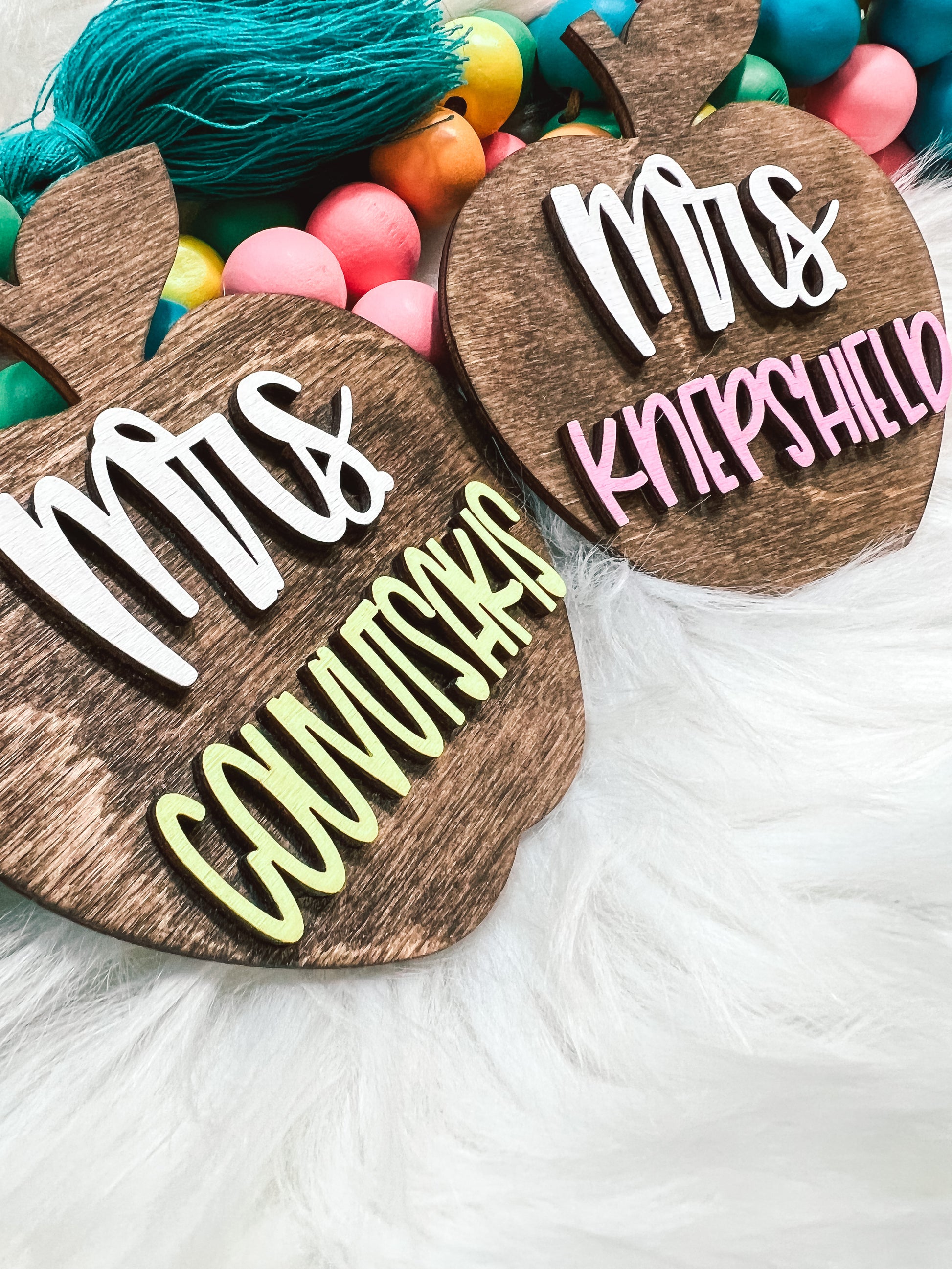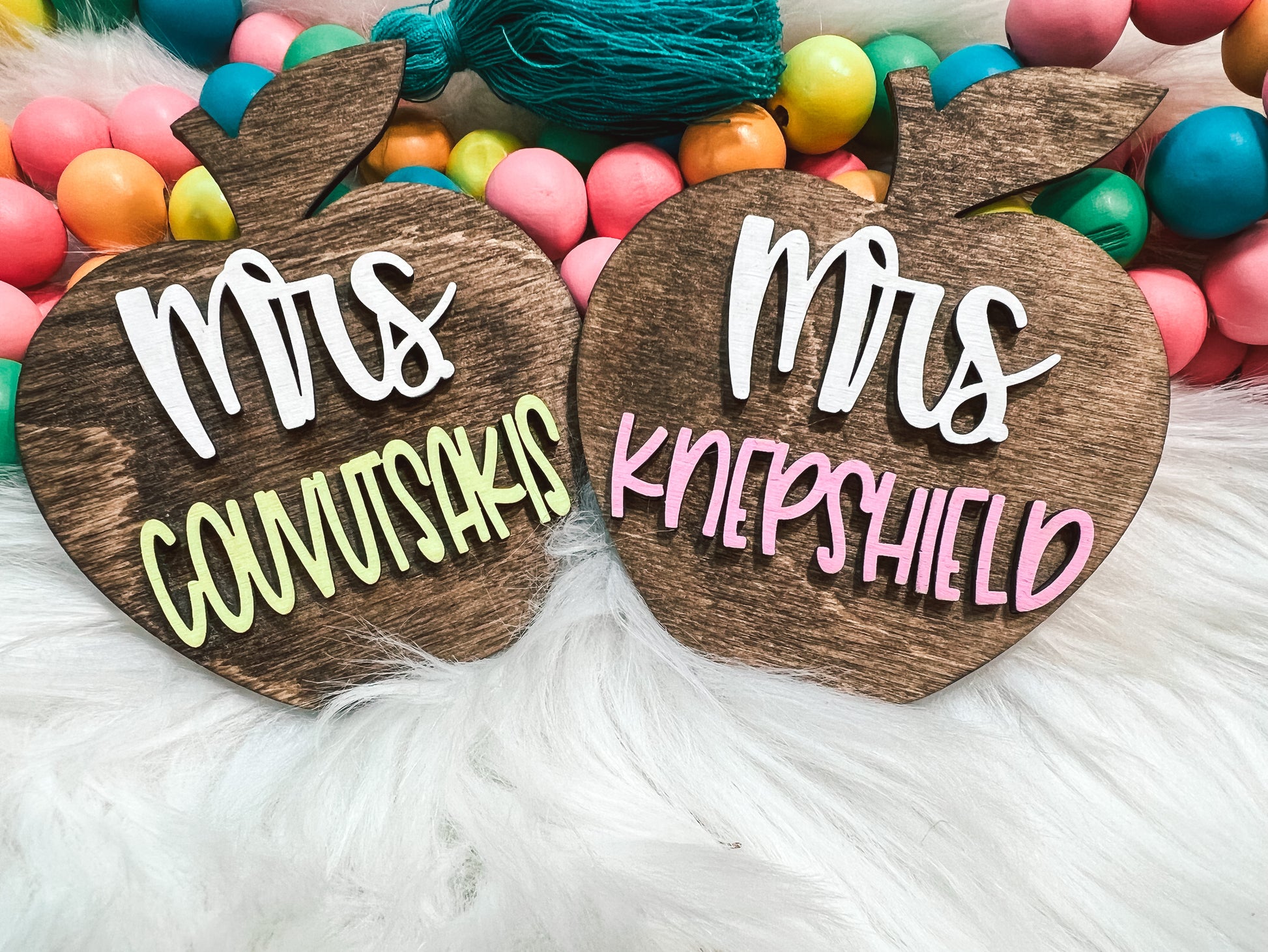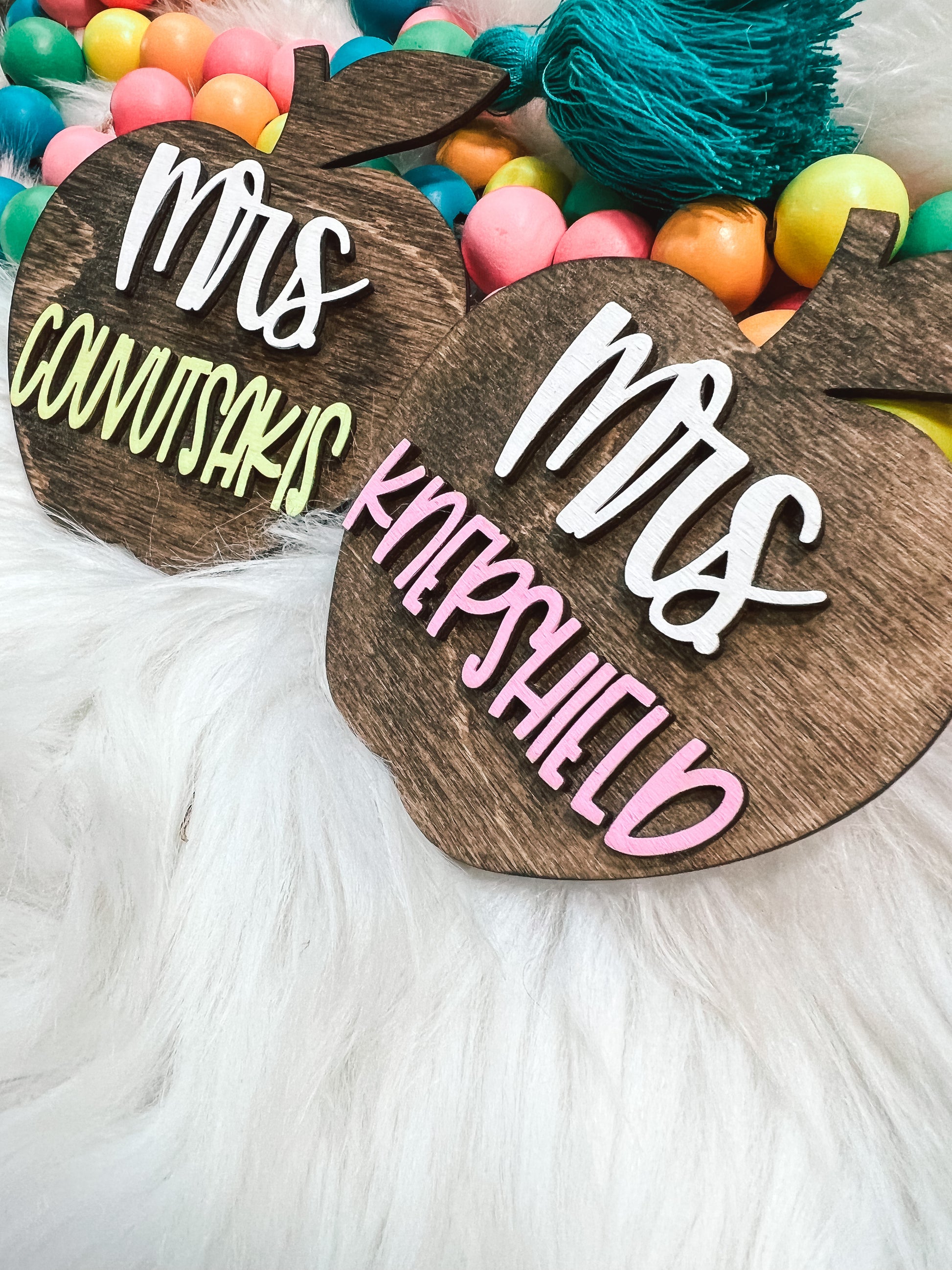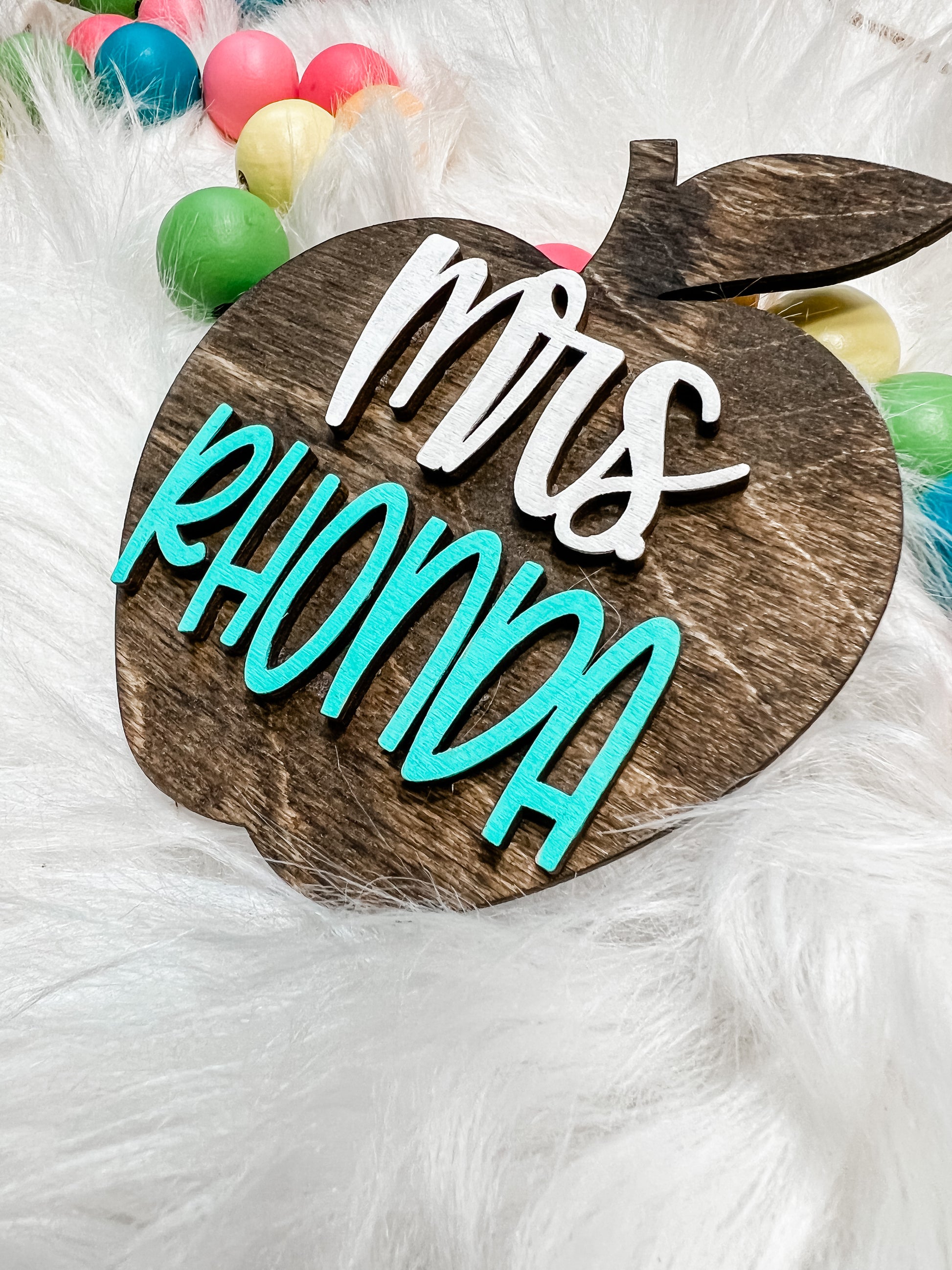 This magnet is around 4 by 3.5 inches in size. It will include the dark stain and two names. The top name will be white and bottom you will be able to pick from the drop down menu.